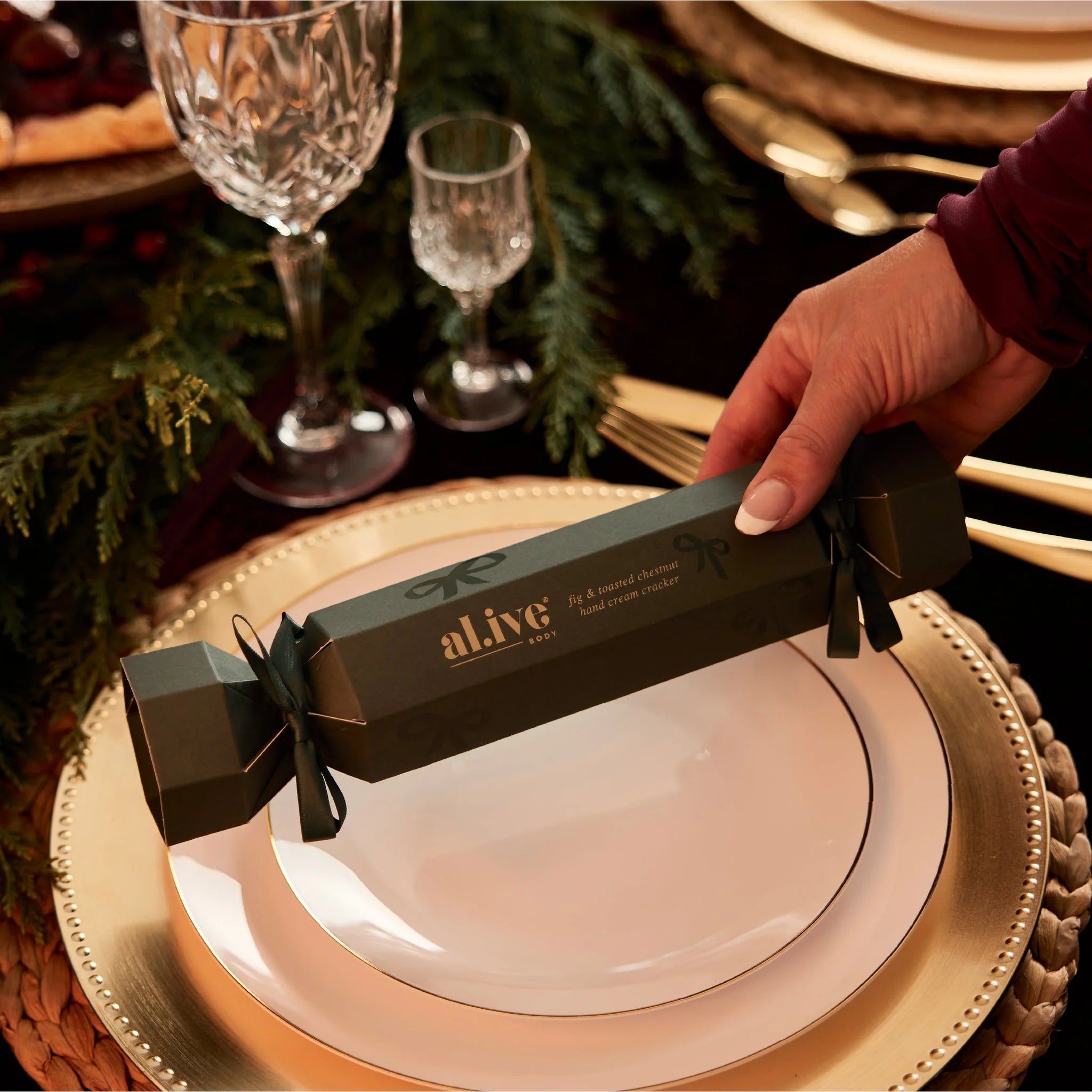 The nourishing Hand Cream in charming cracker packaging that doubles as a tree ornament. Features exclusive Fig & Toasted Chestnut scent with vitamin E and shea butter - a cosy, warming fragrance perfect for festive gifting.