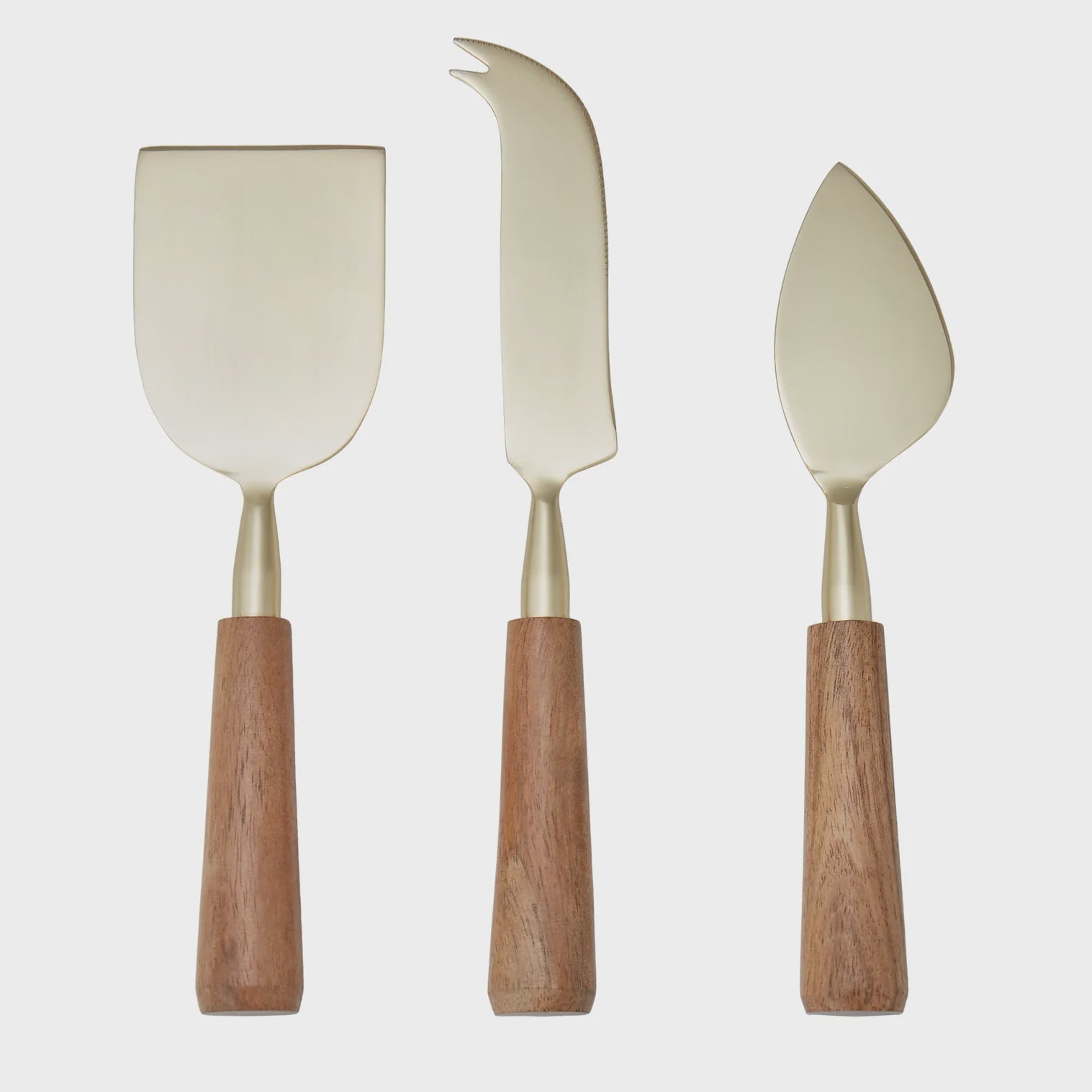 It includes three knives to serve your favourite cheeses in style – both hard and soft! They display charming acacia wooden handles, accompanied by gold stainless steel faces that complement both classic and contemporary interiors alike.