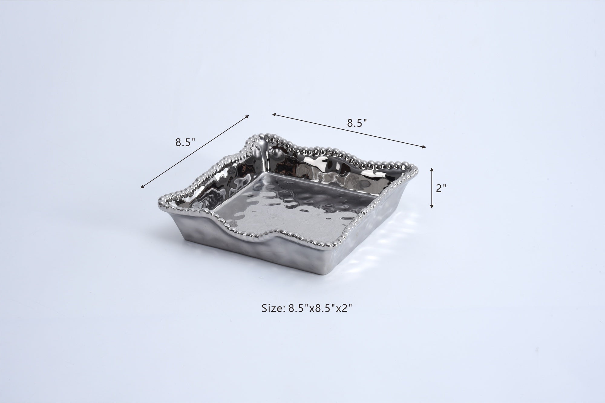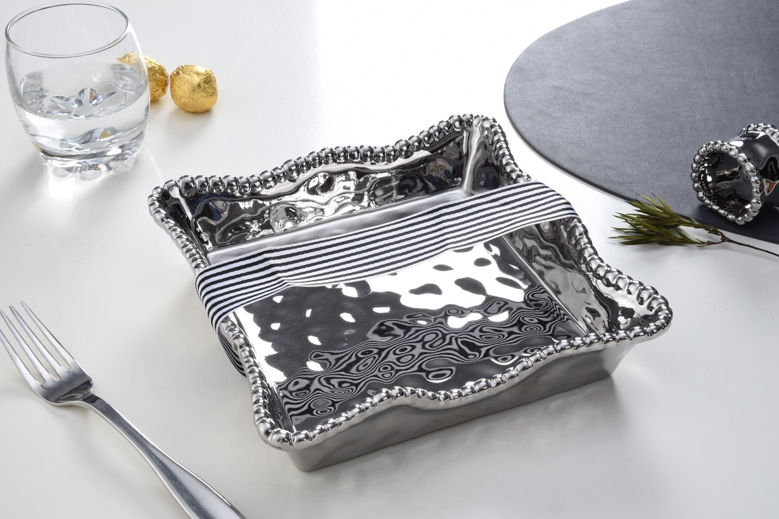 Porcelain luncheon napkin holder in Verona. Add a touch of luxury and elegance to your table setting or buffet with this magnificent luncheon napkin holder. Or use it every day because it is easy care! Also great for serving up small pastries, sliced fruit and other tasty treats. Striking and elegant silver titanium high-fired porcelain luncheon napkin holder. Food safe, dishwasher safe, tarnish free, oven safe up to – Easy Care.