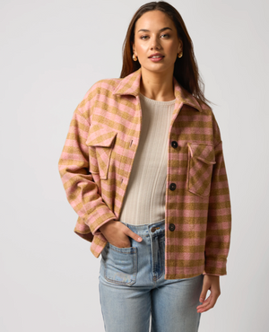 • Relaxed fit check shacket with dropped shoulders, collar, button front and front patch pocket detail.