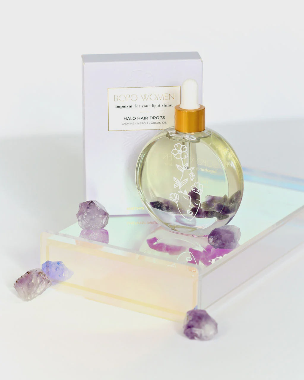 Our Halo Hair Drops is an all natural, multitasking floral hair oil infused with jasmine absolute, neroli, grapeseed and argan oil. Extremely lightweight, this oil gently nourishes split ends and leaves hair feeling strong, shiny and smooth. Suitable for all hair types. Completely free from parabens, sulfates and pthalates.