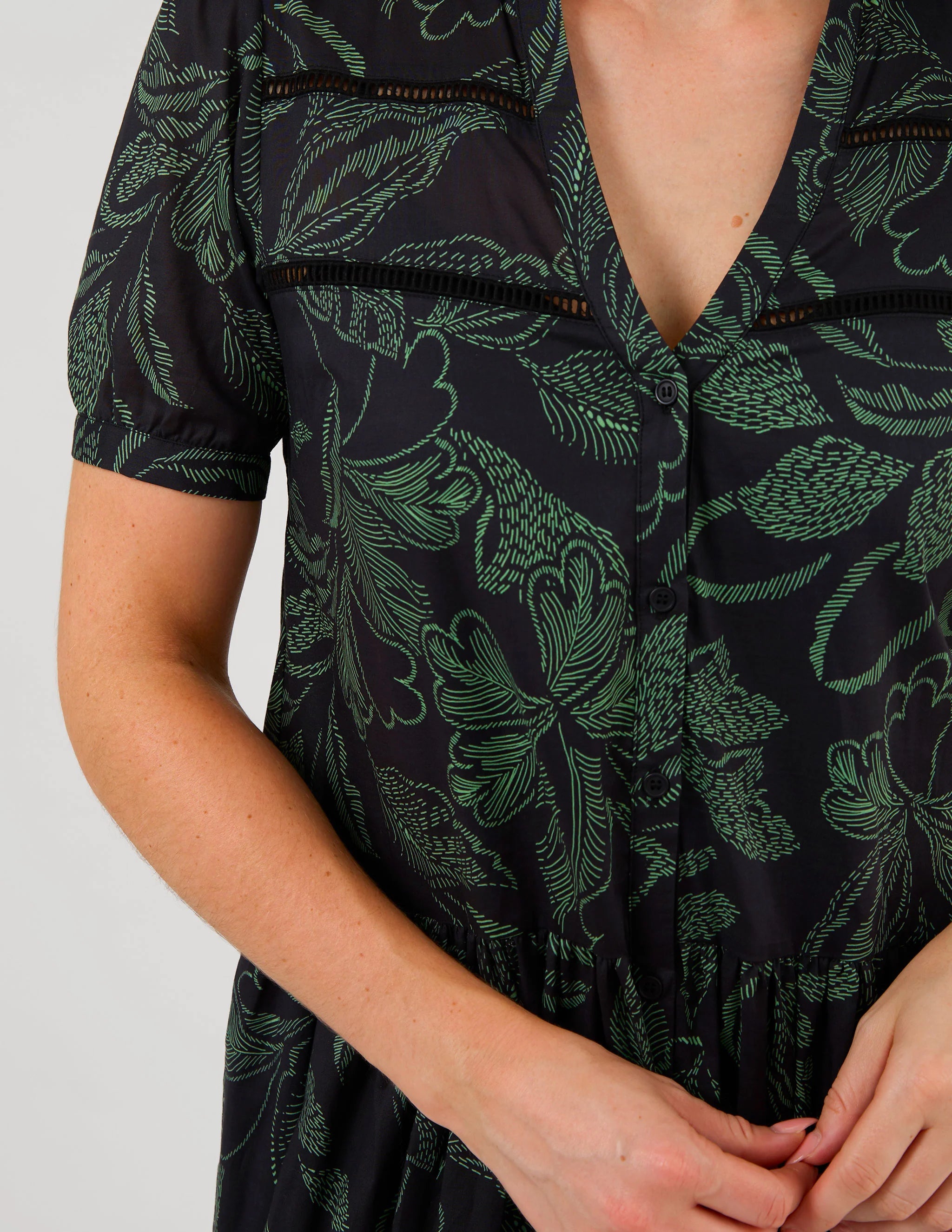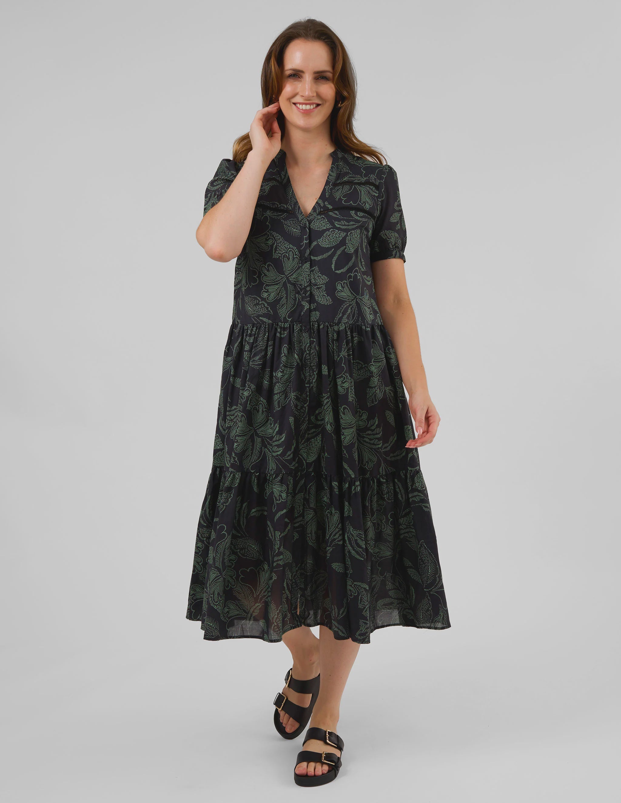 V neck ankle length dress with button front, tiered panels and ladder stitch detail through front yoke