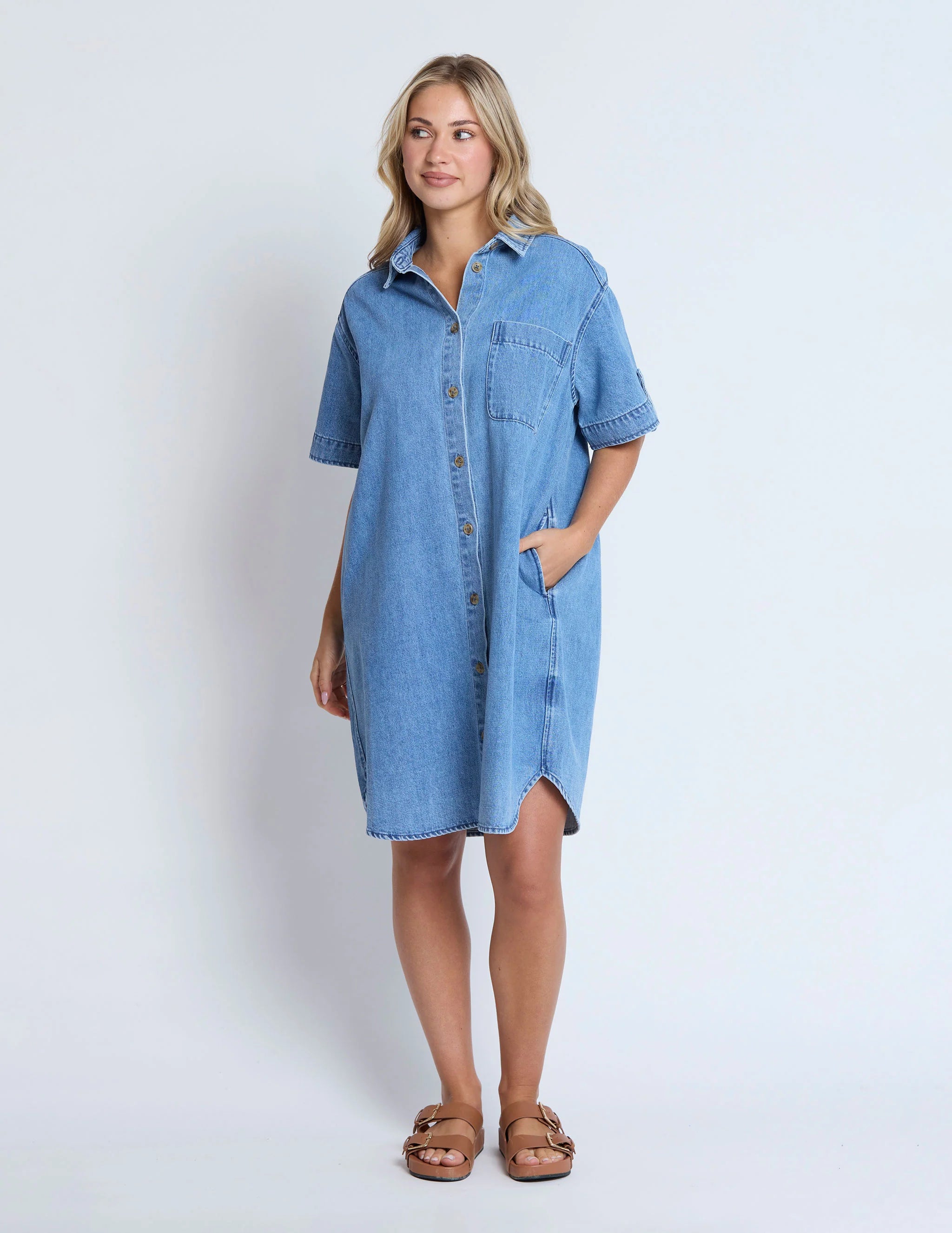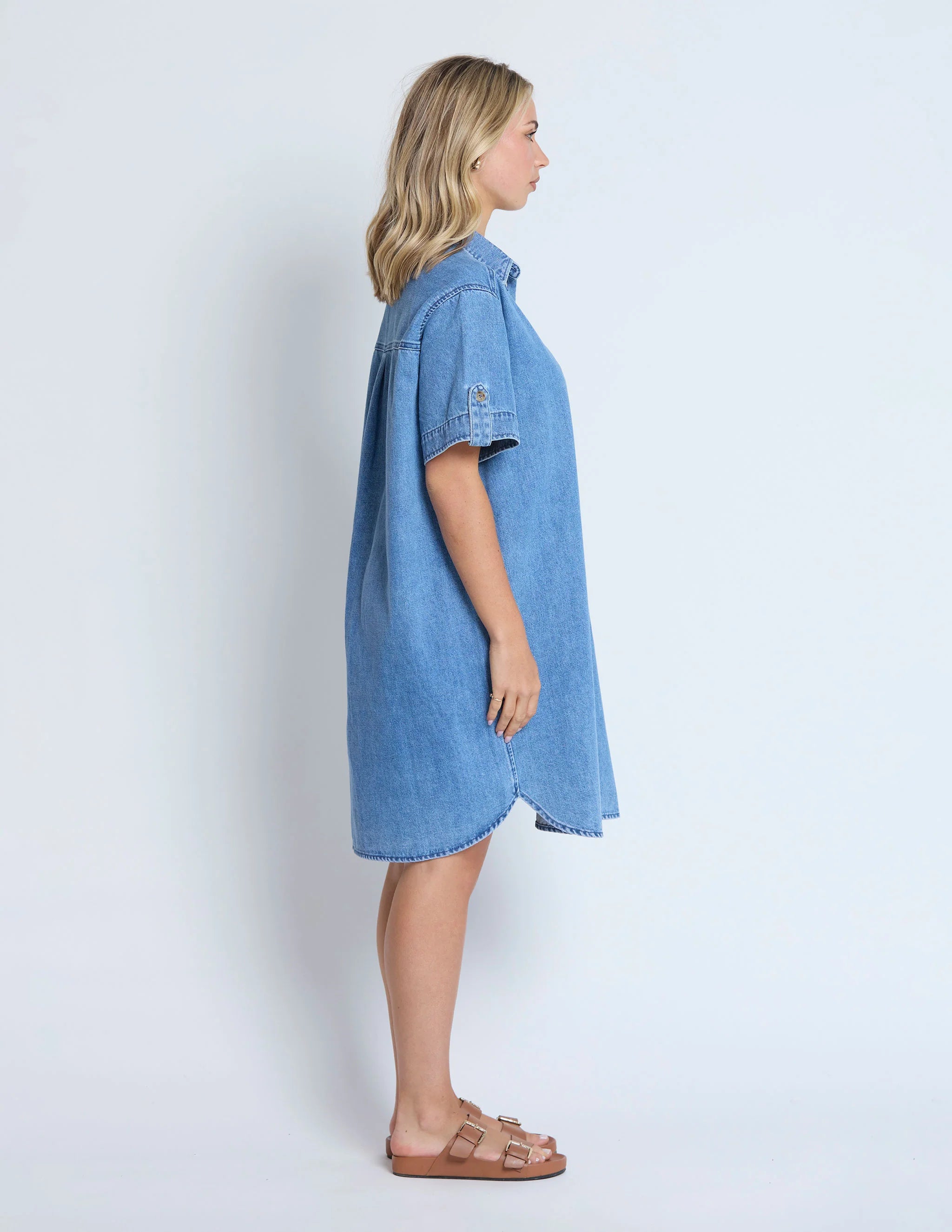 Relaxed fit denim shirt dress with collar, tabs on sleeves with contrast buttons. Curved side hem shaping