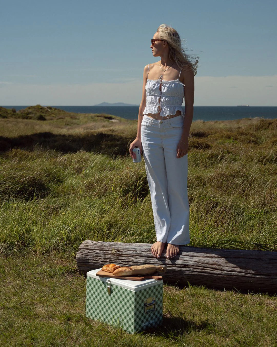The Avocado Gingham Chilly Bin is a fresh take on a classic picnic look. The two-tone green check and cream lid feel nostalgic yet timeless - made for sunny days, shared snacks, and easy summer memories.