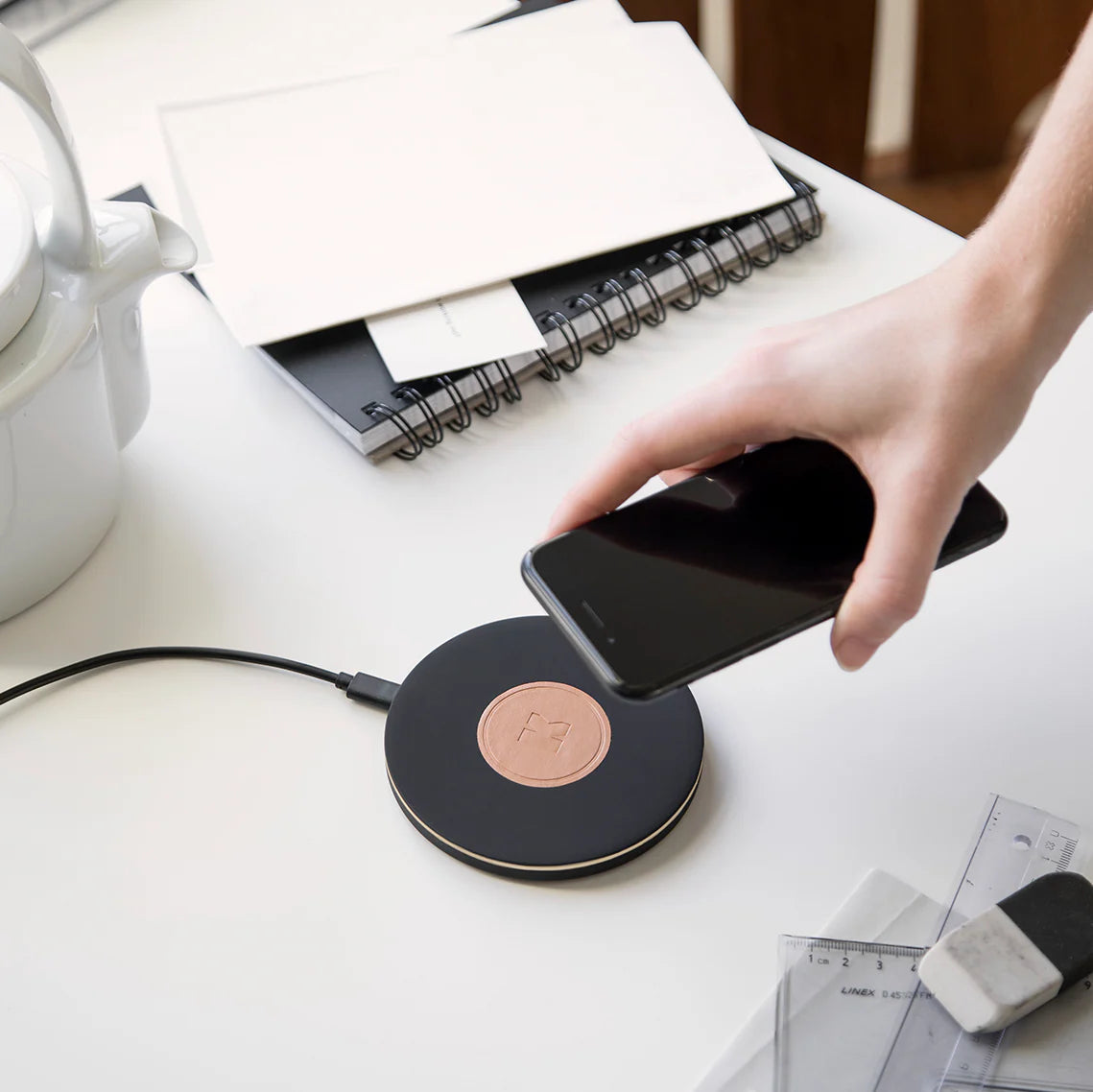 Clean, circular shape and distinctive soft touch surface adds minimalist style to your desk or bedside table.