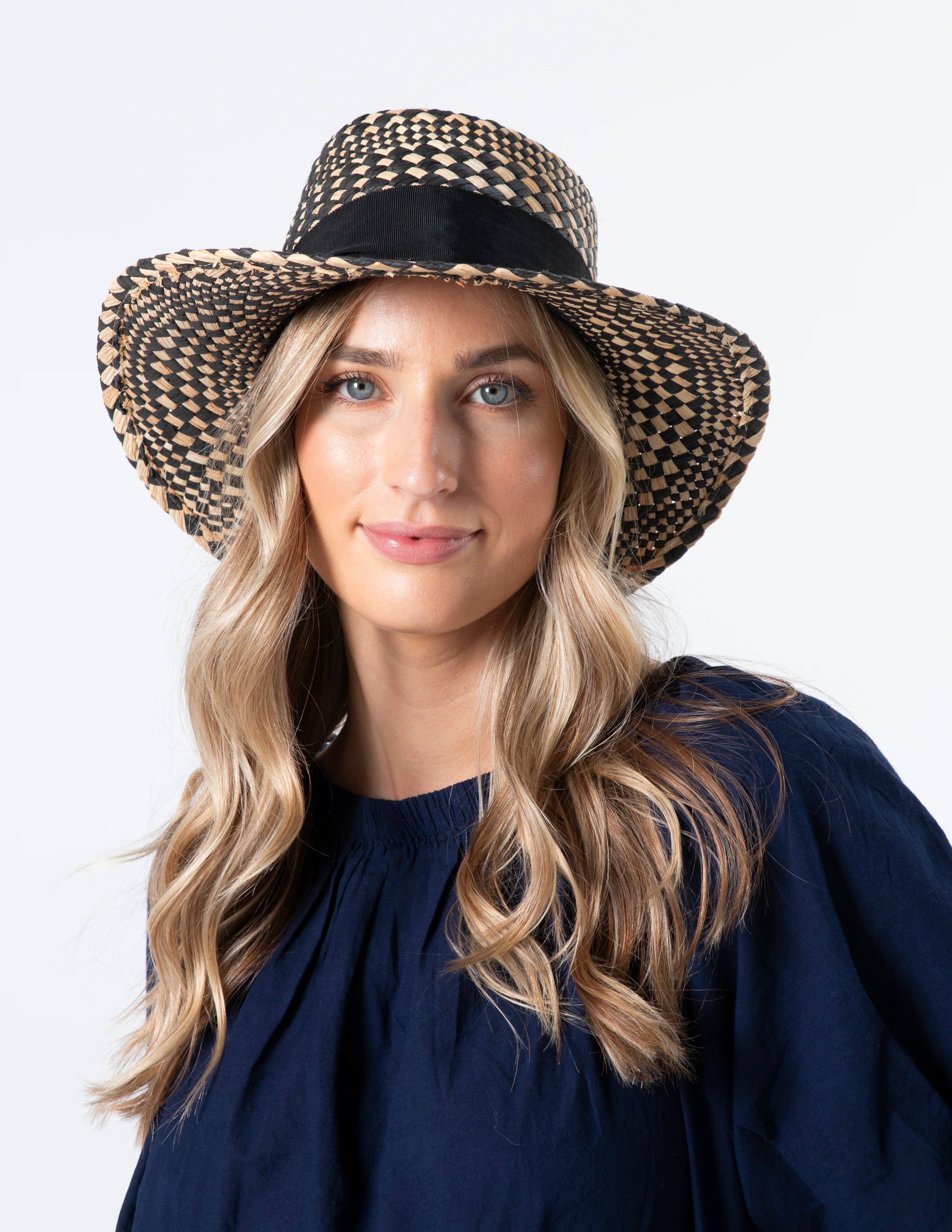 Straw hat diamond check one size 57.5cm brim 8.5cm
