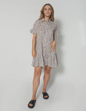 Mid thigh length oversized button front dress with hi-lo hemline and side pockets.