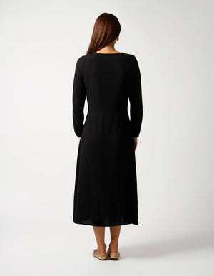 Crew neck midi dress with waist seam shaping and centre front pleat tuck detail at waist.