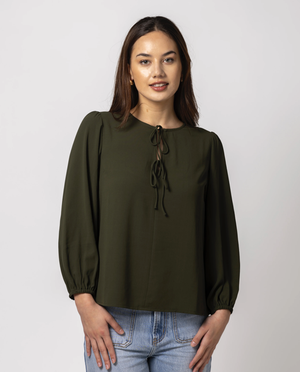 • Blouse with double bow detail at split neckline, gathered shoulder and sleeve cuffs. Embroidery logo.
